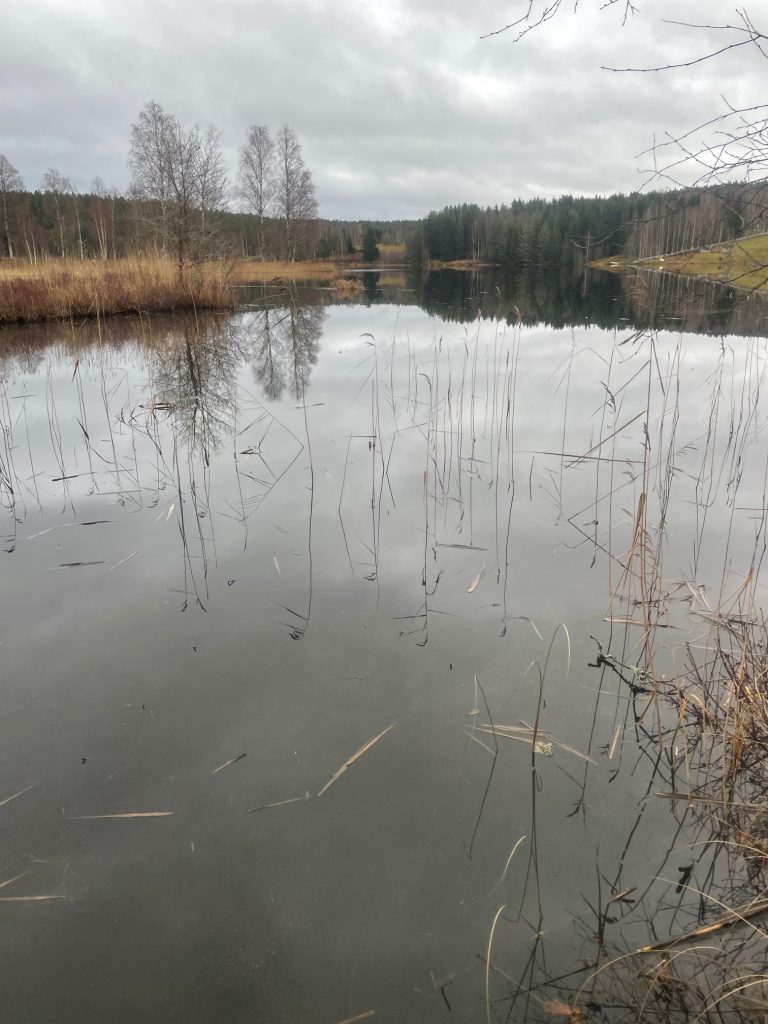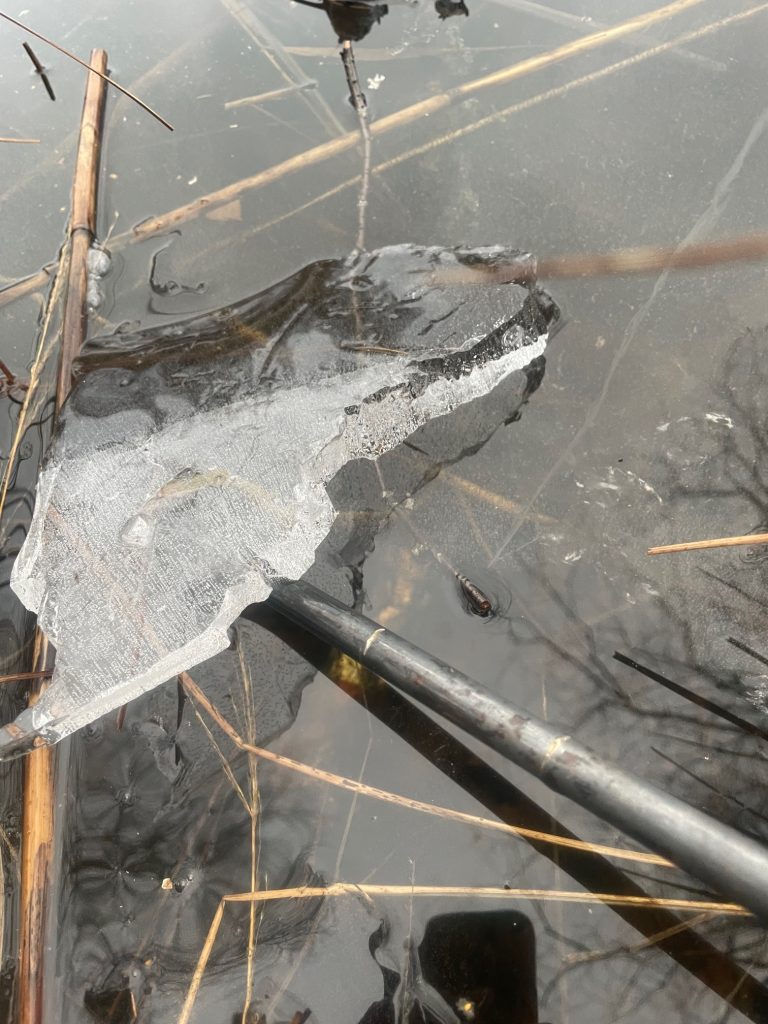 Det varma väder som vi haft de senaste dagarna har mer eller mindre smält isen som hade lagt sig på Burtjärn. Nu återstår bara ett tunt is på ca 2 cm under vattenspegeln.