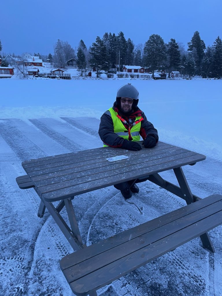 Under dagen har vi satt ut riktkäppar efter banan. Förutom att käpparna guidar oss vid plogning så fungerar håltagningen för att fästa käpparna som en check av istjockleken samt isens kvalitet. Vi vet nu att isen svarar upp till den tjocklek och kvalitet som vi vill ha. Det betyder att vi nu officiellt öppnar isbanan för åkning.
