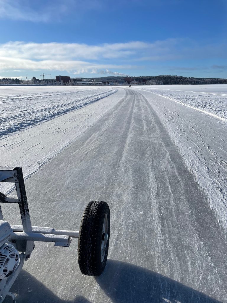 The entire ice track is swept in the middle and plowed on the sides, so feel free to visit our track at Väsman for a skate on the ice or in the ski trail that follows the ice track.